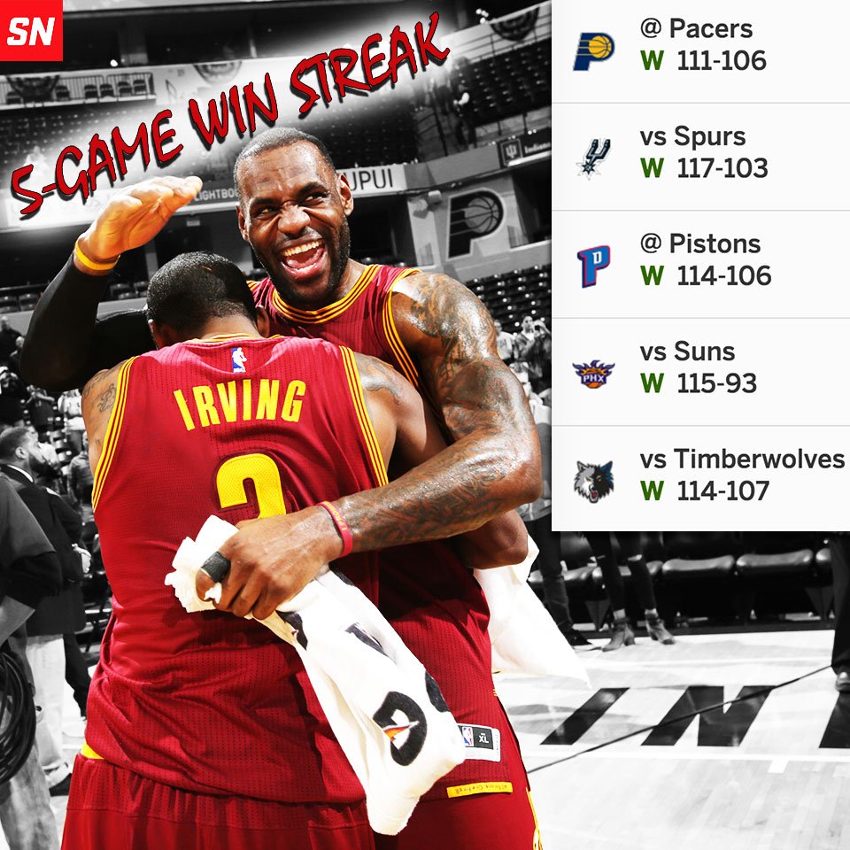 The last time a LeBron James team scored 110+ in 5 straight games?